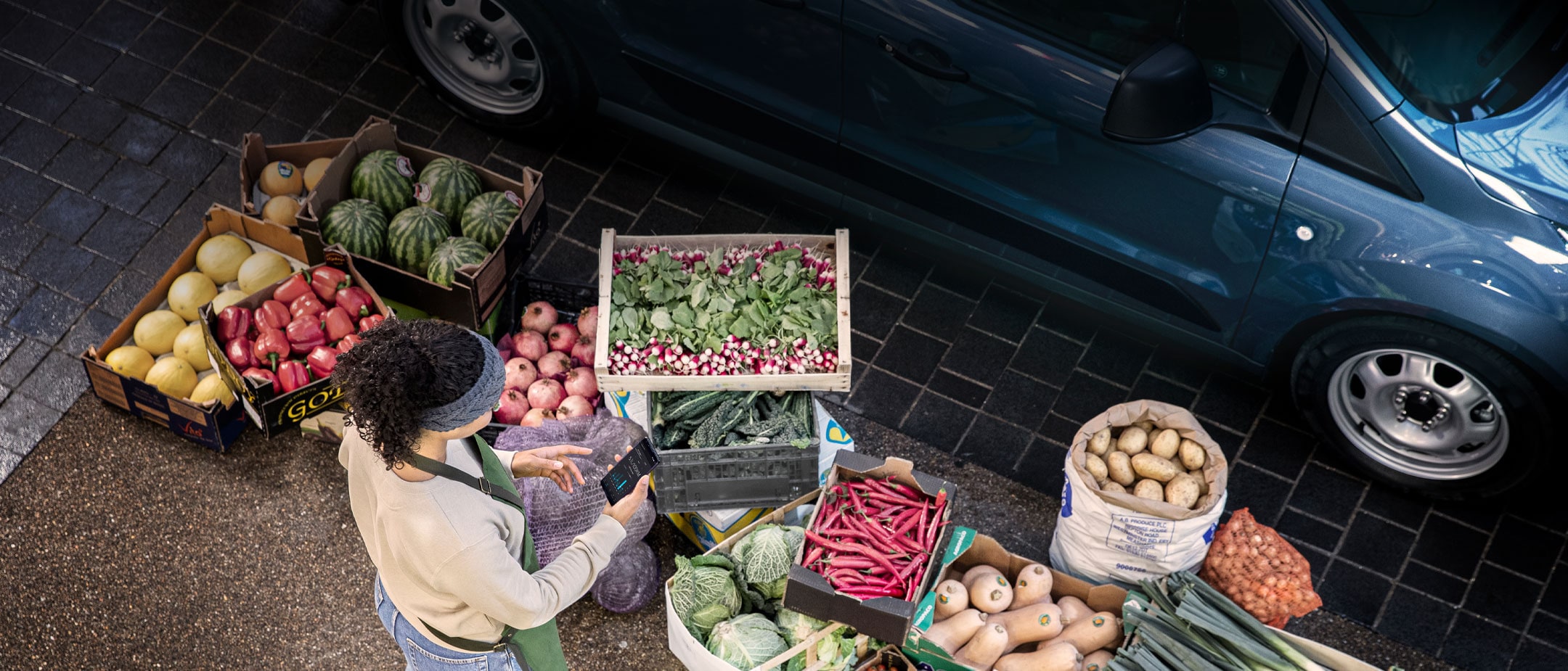 View from above of vegetable seller and boxes with vegetable